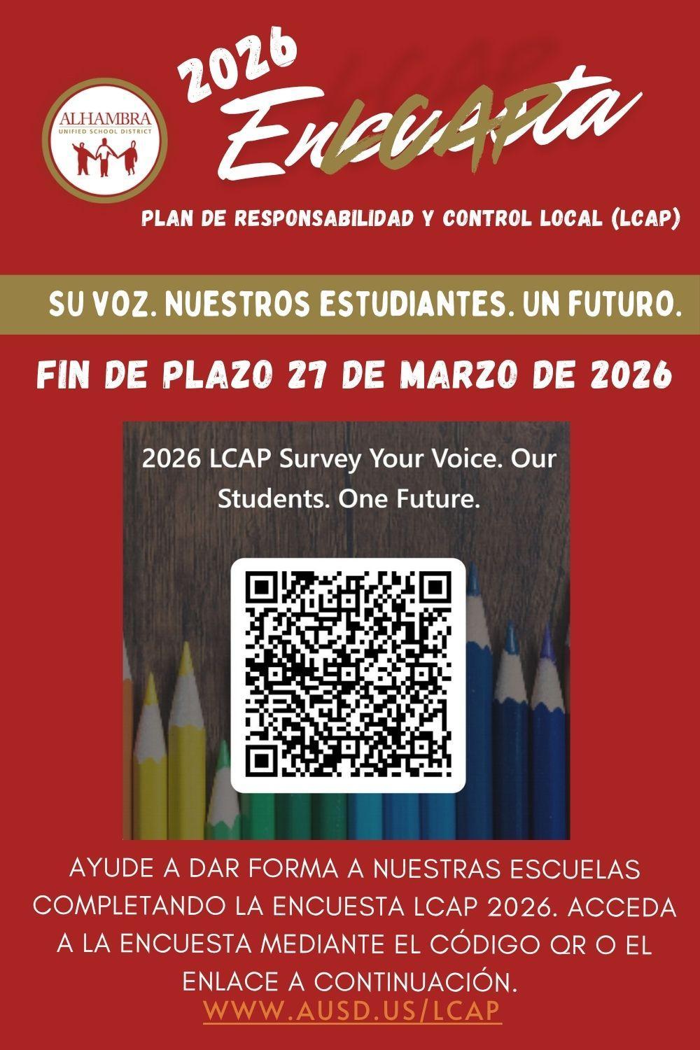Por favor, complete la Encuesta LCAP 2026 y contribuya a mejorar nuestras escuelas. Consulte el folleto para obtener el código QR o utilice el enlace de la encuesta. También se enviarán recordatorios con el enlace.
