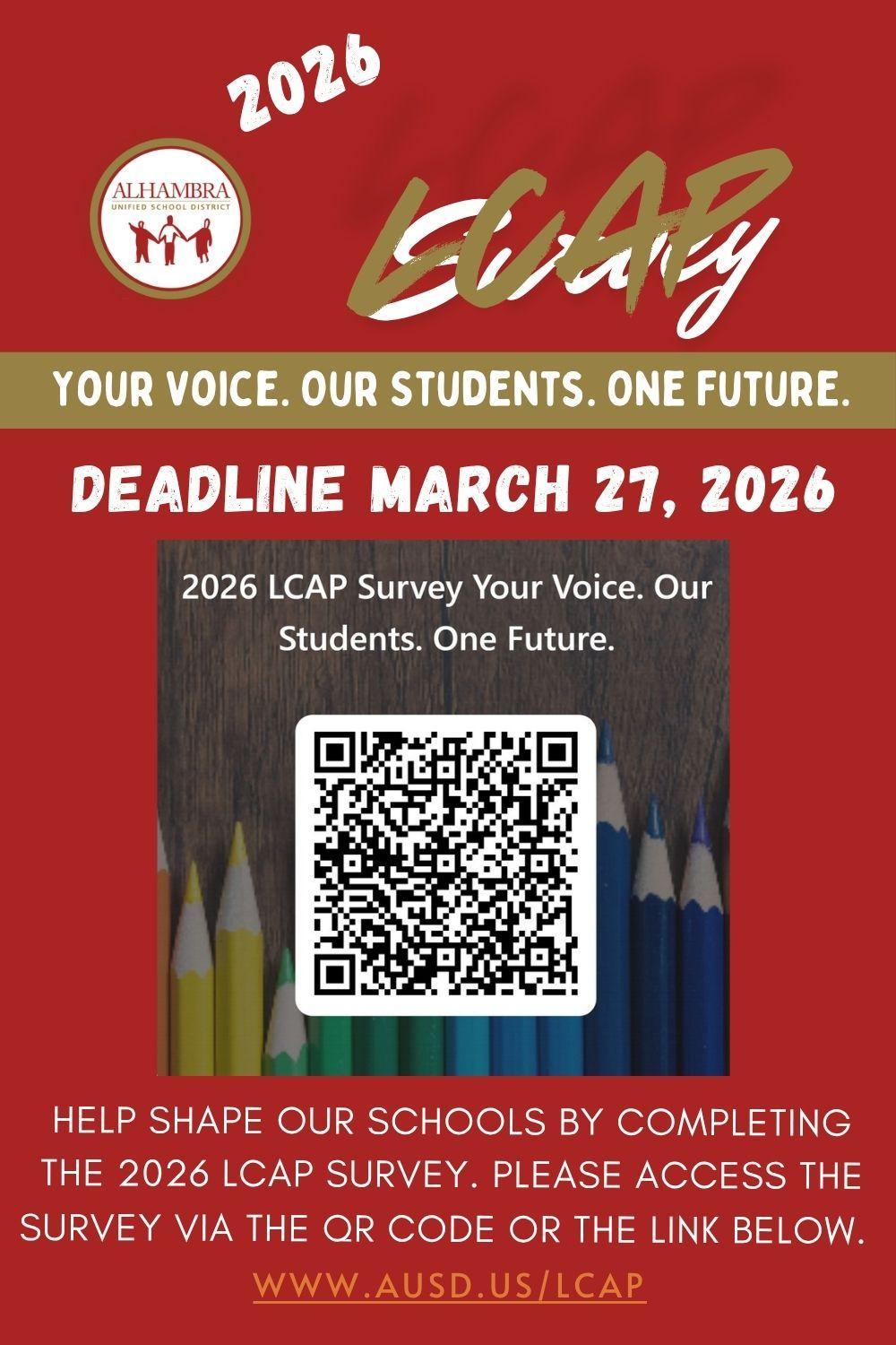 Please complete the 2026 LCAP Survey and help shape our schools. See the flyer for the QR code or use the survey link. Reminder texts with the link will also be sent.
