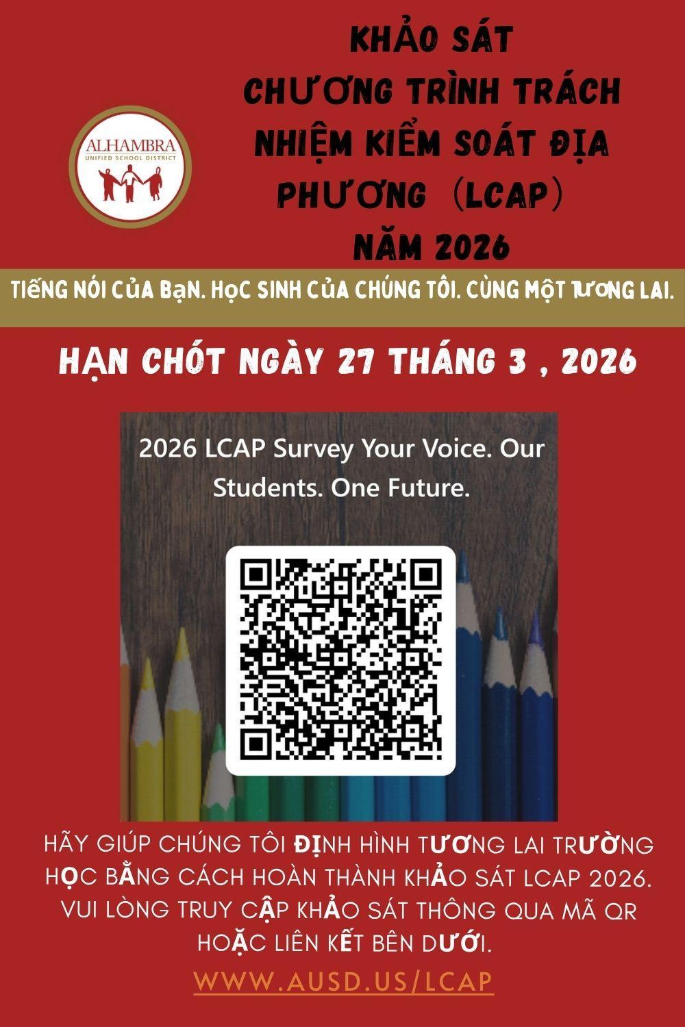 Vui lòng hoàn thành Khảo sát LCAP 2026 và giúp định hình tương lai trường học của chúng ta. Xem tờ rơi để lấy mã QR hoặc sử dụng liên kết khảo sát. Tin nhắn nhắc nhở kèm liên kết cũng sẽ được gửi.
